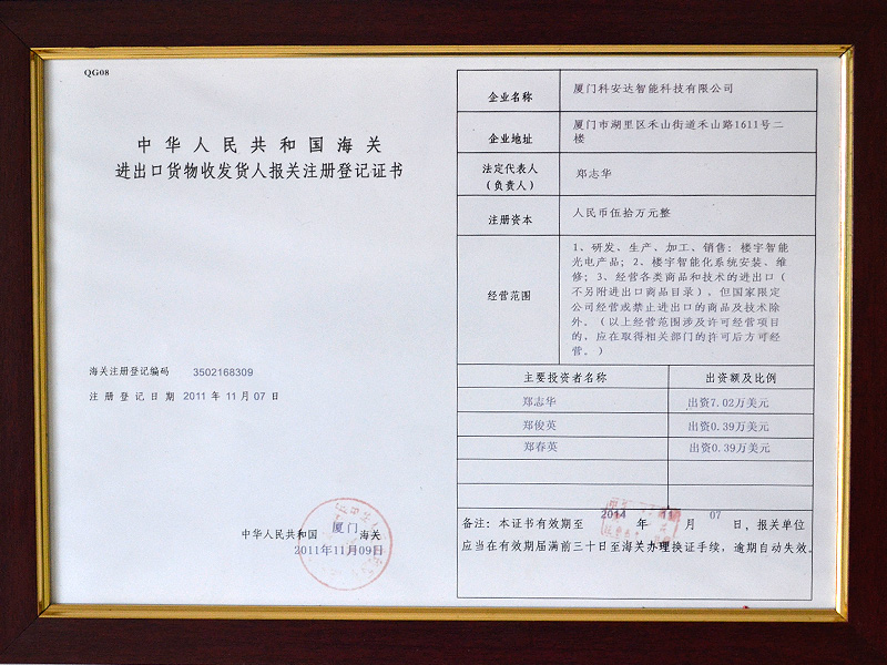 廈門(mén)科安達(dá)智能科技有限公司,是一家擁有完全自主開(kāi)發(fā)能力和生產(chǎn)能力的知名高新技術(shù)企業(yè)。“KAD”是科安達(dá)公司在國(guó)內(nèi)注冊(cè)的全球性品牌,公司已經(jīng)通過(guò)ISO9001:2008國(guó)際質(zhì)量體系認(rèn)證和3C等強(qiáng)制性認(rèn)證,并成為國(guó)內(nèi)外很多知名安防產(chǎn)品的核心合作伙伴 詳情>>